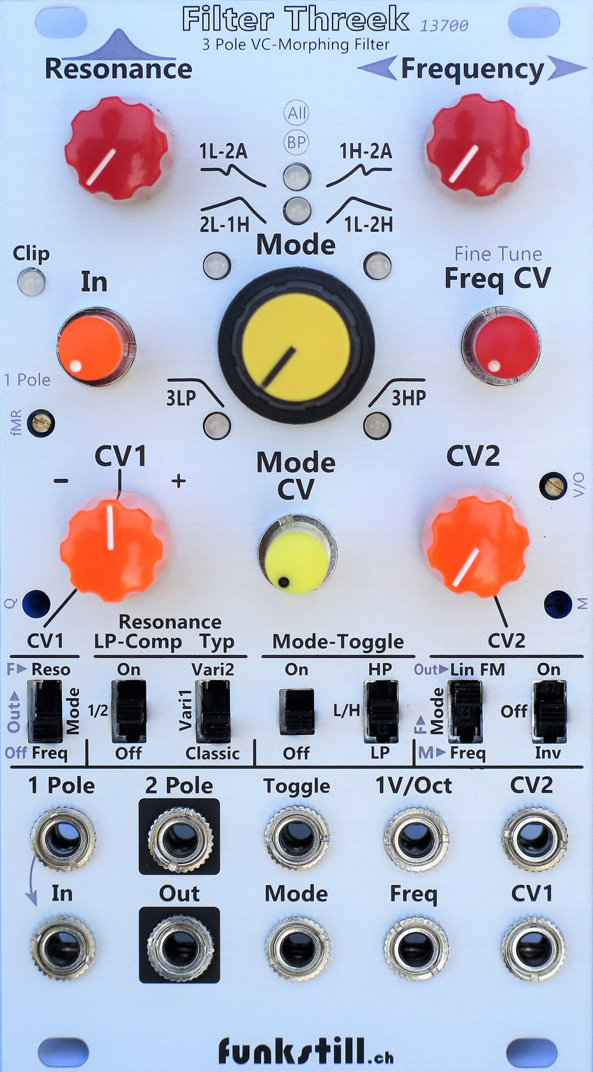 Der Filter Threek ist ein analoges, 3-Poliges Morphing Filter mit 6 stufenlos überblendbaren und CV-modulierbaren Filtertypen (Mode). Das Filter klingt sauber und entfaltet seinen rauen Charakter durch seine vielfältigen Waveshaping-, Rückkopplungs-, und Modulationsmöglichkeiten. Es bietet Selbstoszillation, VC-Mode (stufenlos), VC-Resonance, Lineare FM, Waveshaping (zwischen den Modes), zwei zuweisbare CV Eingänge und mehr. Insbesondere beim Modulieren des Modes im Audiobereich z.B. durch einen VCO oder durch Rückkoppeln des eigenen Ausgangssignals (CV1, Out > Mode) kann man einzigartige und dynamische Klänge erforschen. Mit den zusätzlichen 1 Pole Input und 2 Pole Output stehen insgesamt 12 verschiedene Filter-Modes zur Verfügung. Die Anordnung der Bedienelementen ist zugleich kompakt und bedienerfreundlich. Die Produkte werden in der Schweiz entwickelt, zusammengebaut und getestet.