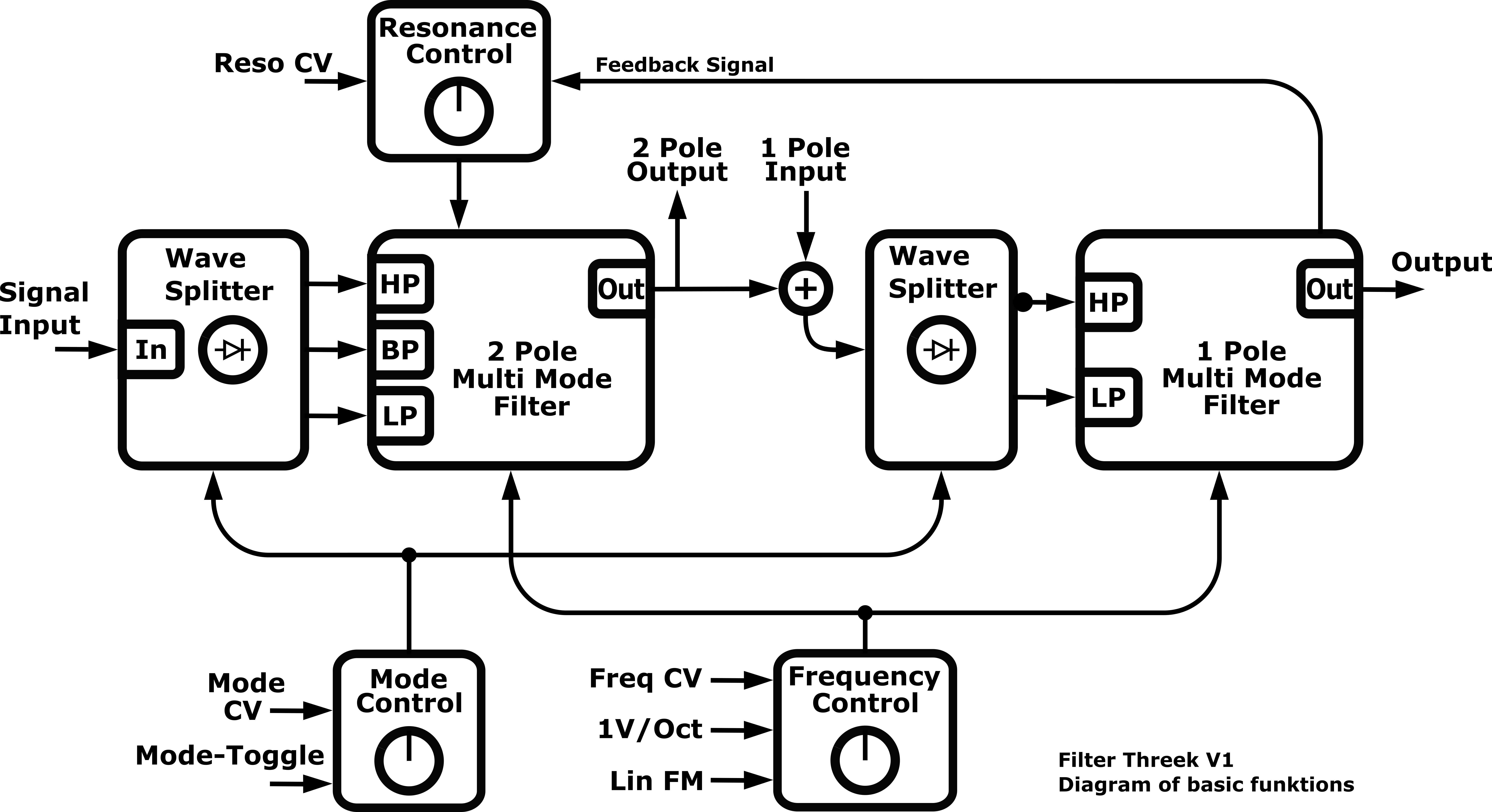 Die Steuerspannung für die Frequenz ist mit der CV1-Buchse normalisiert. Das heisst, wenn kein Signal an der CV1-Buchse anliegt folgt die Resonanz der Frequenz je nach Einstellung des CV1-Potis. So kann erreicht werden, dass z.B. bei hohen Frequenzen die Resonanz automatisch auch höher ist als bei tieferen Frequenzen oder umgekehrt.